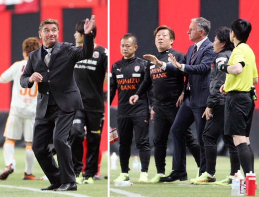 上:左側写真/終始大きなジェスチャーで選手を鼓舞する札幌のペトロビッチ監督、後半27分の時は踊っているかのようにも見えた