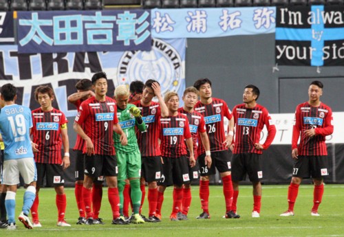 上写真/磐田に0―1と敗れ、依然今季勝利なく表情も晴れない札幌の選手たち、左からMF兵藤(6番)、FWヘイス、MF都倉(9番)、GK菅野(1番)、DF横山、石川(32番)、MF白井(19番)、菅、DF早坂(26番)、FW内村(13番)、MF荒野(27番)