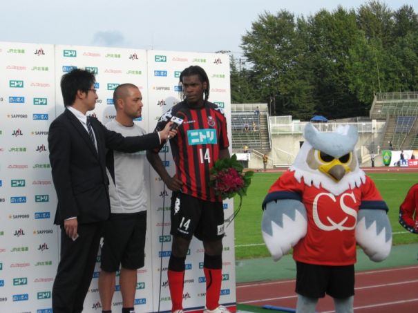 9月6日、札幌厚別競技場で行われた札幌―愛媛で逆転の3点目を入れ、お立ち台でインタビューを受けるダニルソン(poto−jun)