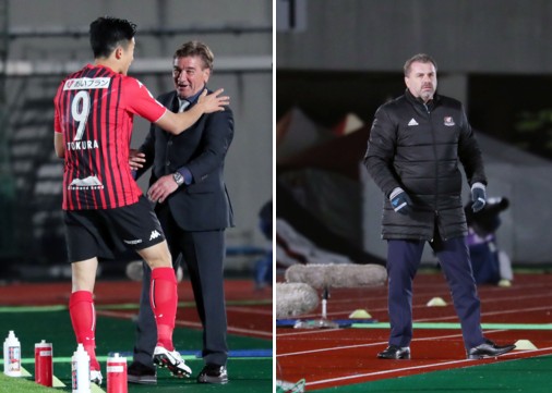 上:右側写真/試合中、どっかとベンチに腰を下ろしたままだった横浜のアンジェ・ポステコグルー監督が先制点が決まった前半44分、飛び出して「どうだ!」と言わんばかりの表情