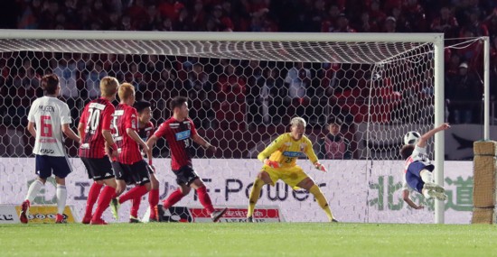 勢いに乗ったホームの札幌は後半21分、菅が激しいプレスから高い位置でボールを奪い、一気に左サイドを突破しクロスを供給。すると後方から勢い良く走り込んできた進藤が、相手DFをものともしない豪快なダイビングヘッドで叩き込む逆転ゴール。進藤はDFながら今季3得点目と、サポーターを湧かせてみせた。