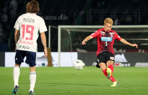 上写真/後半4分、札幌FW都倉の同点ゴールを呼ぶクロスを得意の左足で蹴り込むDF福森(5番)。左横浜FW仲川(19番)