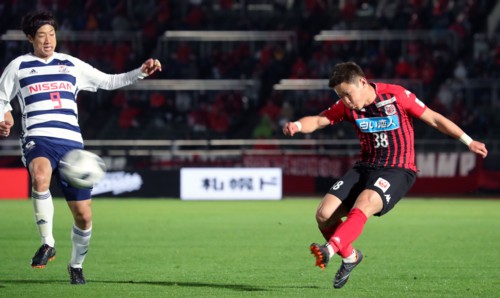 試合は前半、小雨で濡れたピッチを生かすように早いパスをつなぎ、互いにボールポゼッションを大事にする姿勢が見られる。先手を取ろうとしたのは横浜、前半3分に横浜のFWウーゴヴィエイラが頭でファーストシュート。これは札幌GKクが防いだが、前節でハットトリックを決めているこのポルトガル人FWをどう対処するかも重要なタスクとなる。