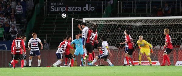 どちらに転ぶか分からない展開だったが、前半終了間際の44分に試合が動く。横浜の左からのCKをMF天野が左足でゴールから逃げていくボールを送る。これをDF中澤がペナルティーエリア中央から外へ大きく逃げてフリーとなり頭でボールを中へ折り返す。ぽっかりと空いたスペースに金井が頭から飛び込み角度を変える先制点。札幌はゴール前で相手選手を2度もフリーとしてしまう連携ミスが響き、1点ビハインドで試合を折り返す。