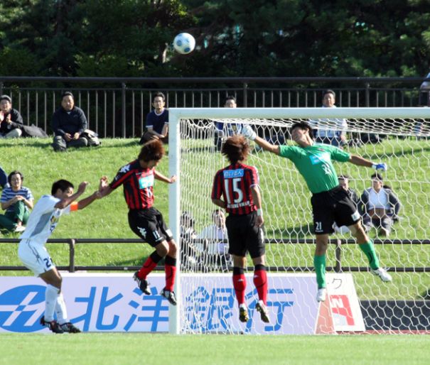 好天に恵まれたが海からの風は強い。前半風上を取ったコンサドーレは、動きは良かったがシュートが正確さを欠いて0点。さらに17分にはダニルソンをけがで欠いた。だが、後半3分にこの日中盤に入っていた上里一将が、相手ペナルティーエリア前で反則を得てフリーキック。左足でゴール右にカーブの懸ったボールを決めた。このまま逃げ切ったがサポーターは気が気ではなかった。