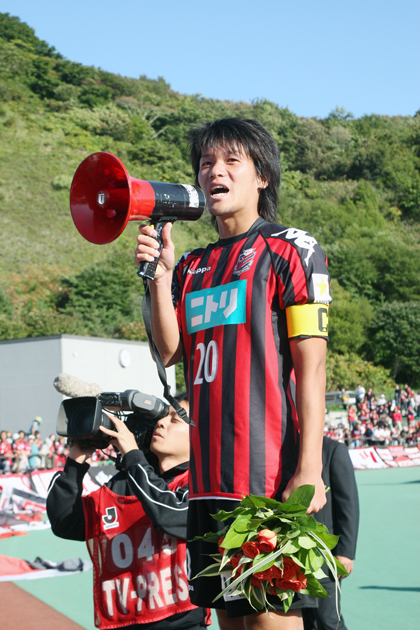 上写真/福岡戦で勝利しヒーローインタビュー後、ゴール裏熱烈サポーターにハンドマイクで話をする札幌MF上里。2ヶ月前”釈明”させられたのとは大違いだ