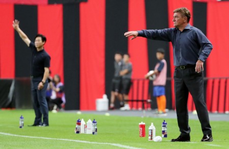 上写真/後半29分、選手たちに指示を出す札幌のペトロビッチ監督(右)とC大阪の尹晶煥監督