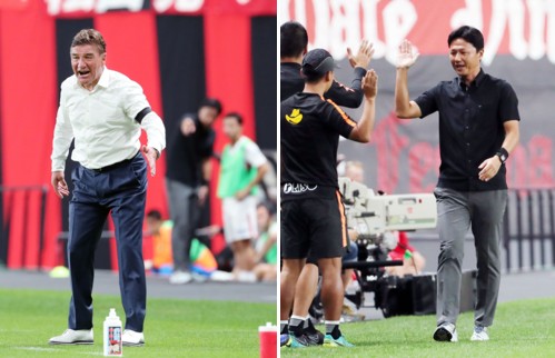 上:右側写真/前半24分、先制点が決まりスタッフとハイタッチで喜ぶ鹿島の大岩剛監督