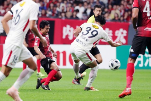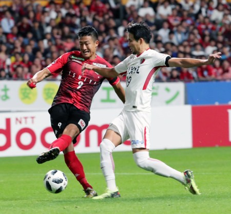 上写真/後半5分、札幌MF都倉(9番)が鹿島DF犬飼(39番)と競りながらシュートを放つが、犬飼の方が一瞬早くクリアする