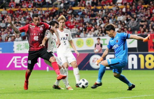 上写真/前半42分、札幌自陣からDF福森のロングパスを受けてFWジェイ(48番)が鹿島DF犬飼と競りながらシュートするがGKクォン・スンテ(右)にストップされる