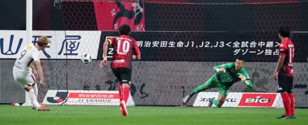 上写真/後半3分、鹿島MF安西がもらったPKをFW鈴木(9番)が札幌GKク・ソンユンの動きを見ながら慎重に決め追加点を上げる、鈴木は2ケタ得点に到達した。中央札幌MF宮澤(10番)、右MFチャナティップ