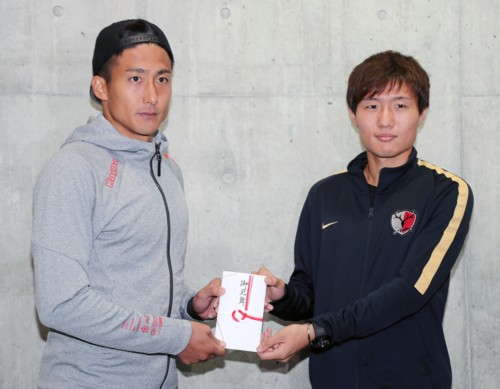 上写真/9月23日の鹿島アントラーズとの試合終了後、鹿島の選手会副会長の三竿選手(右)から地震のお見舞いを受け取る札幌の選手会会長の都倉選手