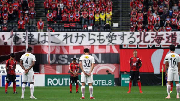 上写真/鹿島戦開始前、選手とスタンドの観衆が一緒に、胆振東部地震の犠牲者に黙とうを捧げた