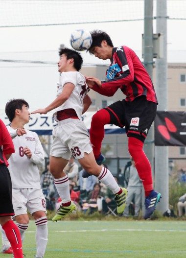 上写真/10月6日、コンサドーレ札幌東雁来グランドで行われたプリンスリーグ北海道最終節、旭川実業高校との試合。旭実MF河合(63番)とヘッドで競り合う札幌DF中村(右)