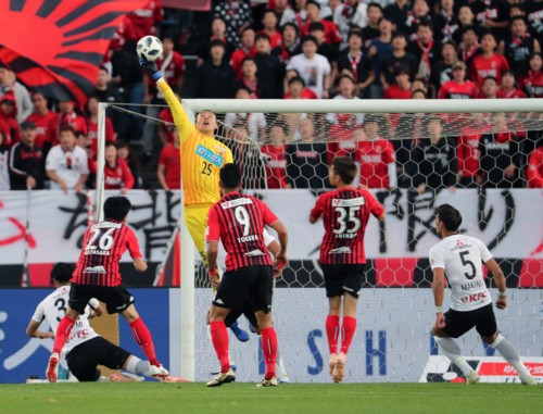 上写真/後半1分、浦和の猛攻を札幌GKク・ソンユン(25番)が右手を伸ばしてクリア。左端浦和DF岩波(31番)、右端槙野(5番)、札幌の選手は左からMF早坂(26番)、FW都倉(9番)、DF進藤(35番)