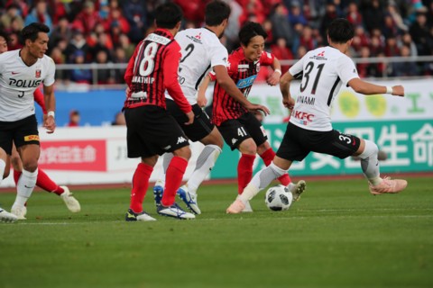 しかし、ワンチャンスを確実に仕留めたのはアウエーの浦和。前半6分、ボールを自軍で奪った浦和は、素早くMF長澤につなぎ、ドリブルから浮き玉のボールをDFラインに入れる。ここに走り込んだ浦和武藤はうまい胸トラップで抜け出し、スピードに乗って左足で先制ゴール。DFラインのカバーに入ったボランチの一瞬の隙を見逃さなかった。