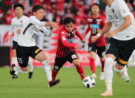 上写真/後半追加タイム4分、札幌MFチャナティップ(18番)が狭いエリアをドリブルで攻めるが、浦和DF長澤(15番)が手足を伸ばして懸命に防ぐ、右端は岩波(31番)