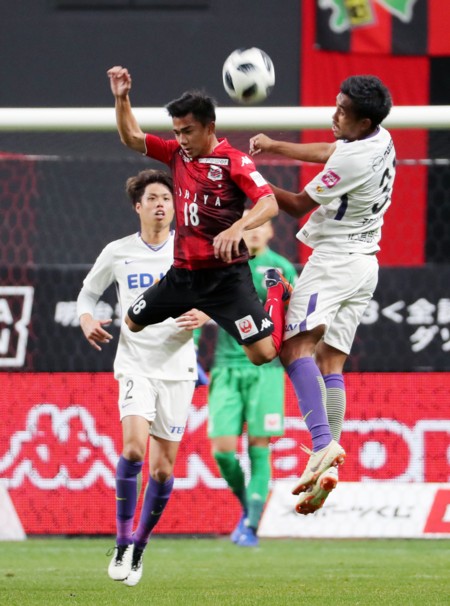 上写真/広島との最終戦、後半17分、札幌MFチャナティップ(18番)と広島FWティーラシンが高々とジャンプしてヘディングを競い合う(12月1日、札幌ドーム、撮影・石井一弘)