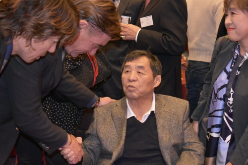 上写真/石屋製菓石水勲会長(中央)夫妻のメインテーブルであいさつするペトロビッチ監督と杉浦大輔コーチ(上写真のみPhoto Jun)