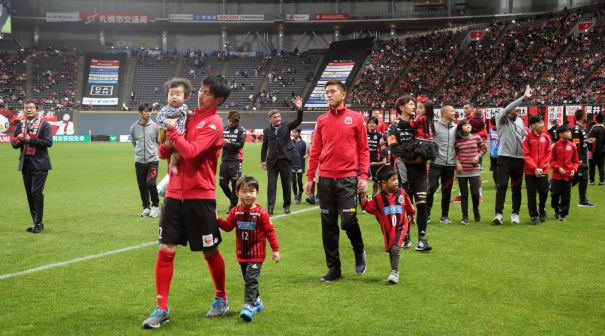 上写真/北海道コンサドーレ札幌は12月1日、札幌ドームでの最終節、サンフレッチェ広島と2−2で引き分け、J1最終順位4位でシーズンを終えた。試合後のセレモニーでスタジアムを一周する選手たちとその家族(写真は1から9枚目まで撮影・石井一弘)