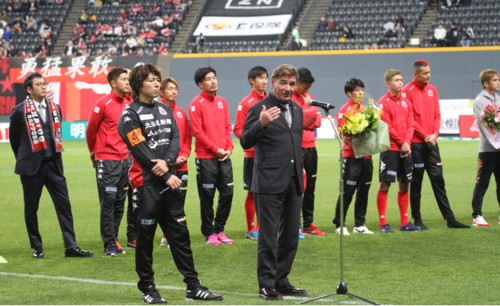 上写真/シーズンを通して応援してくれたサポーターにあいさつをする野々村社長