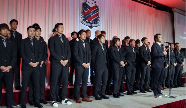 上写真/12月7日に札幌のプレミアホテルTSUBAKIで行われた「感謝の集い」。勢ぞろいした選手、スタッフを後ろにあいさつをする野々村社長、その後方にペトロビッチ監督
