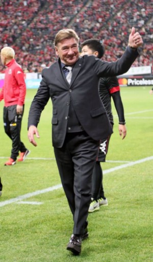 上写真/最終節後のセレモニーでスタジアムをまわり、サポーターに手を上げて応えるペトロビッチ監督