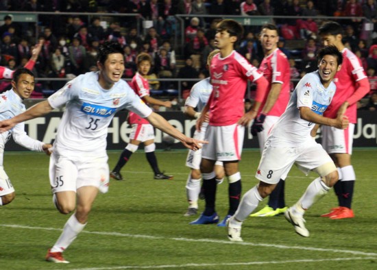 上写真/3月2日、キンチョウスタジアム、セレッソ大阪戦での写真。後半34分、札幌DF進藤(35番)が同点ゴールを決めベンチ方向へ走り出す、同時にMF深井(8番)、チャナティップ(左端)も笑顔で追いかける。リーグ戦初得点の3選手がそろった
