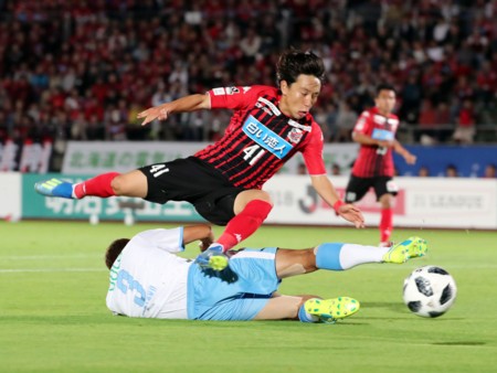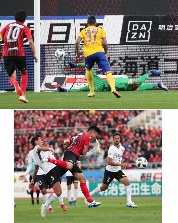 上:下段写真/11月10日、札幌厚別公園競技場、浦和レッズ戦での1シーン。前半39分、札幌FW都倉(9番)が浦和ゴール前に攻め込むが、日本代表DF槙野(5番)に一瞬早くクリアされる。右マウリシオ(2番)、都倉の鼻先に槙野の足先が伸びている