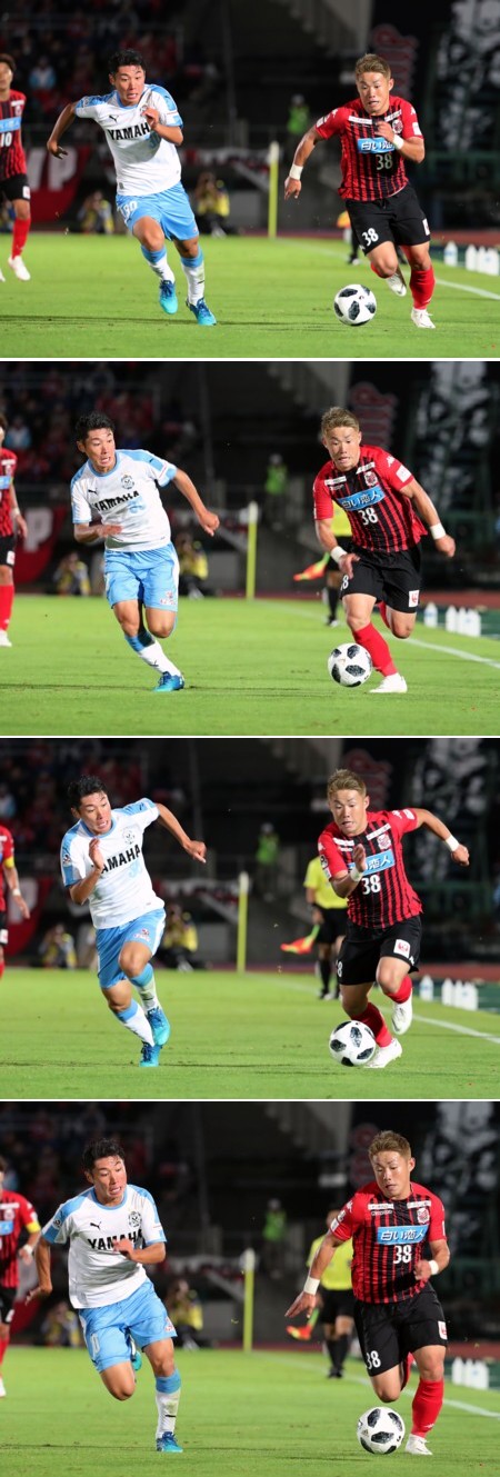 上写真/7月22日からもう1シーン。ボールを受けた札幌MF菅(38番)が左サイドをドリブルで駆け上がる。それを、こちらも若手、磐田のMF上原(30番)が必死に追撃している4連続写真。2人の選手の手の動き、足の運びがほとんど一緒(なんと両ひじ高さ、両ひざの角度もピタリ!)。長い間、カメラマンをやってますが、こんなことは珍しく皆さんにご紹介しました