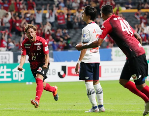 上:中段写真/同じく9月1日、神戸戦の後半5分、札幌FW都倉(右)が左サイドからDF福森の上げたクロスを右足で合わせて追加点を上げる