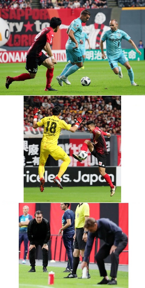 上:上段写真/9月は別々に3枚。まずは9月1日、札幌ドーム、神戸戦の前半4分、札幌ゴール前に迫ってくる神戸のFWポドルスキ(10番)とMFイニエスタ(8番)、左札幌FW早坂(26番)。世界的スーパースターの迫力に、この試合どうなるのか、不安がよぎった