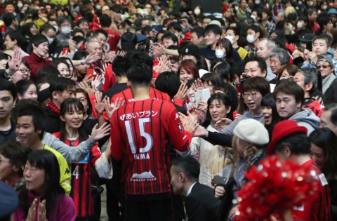 上写真/長崎への期限付き移籍から復帰したMF中原(6番)がファンの「お帰り!」の声に「ただいま」と応じた