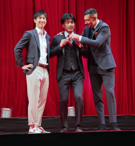 上写真/新しいフォーマルスーツを着てお披露目をするDF石川(左)、MF早坂(中央)、FWジェイの3選手。早坂がネクタイの内側の赤を自慢している