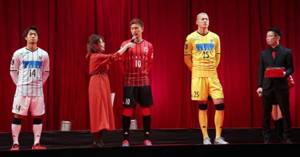 上写真/新デザインのユニホームの着心地を話すホーム用を着たMF宮澤(10番)、左はアウエー用を着たMF駒井(14番)、右はGKク・ソンユン(25番)