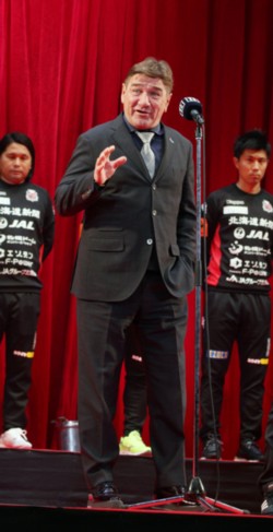 上写真/北海道コンサドーレ札幌キックオフ2019であいさつする野々村芳和社長