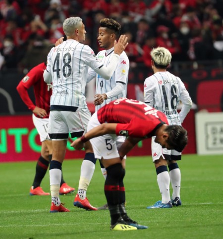 上写真/強敵浦和に2−0と勝利しハイタッチで喜ぶ札幌FWジェイ(48番)、鈴木に対し浦和のDF槙野(5番)は腰を折ってガックリ