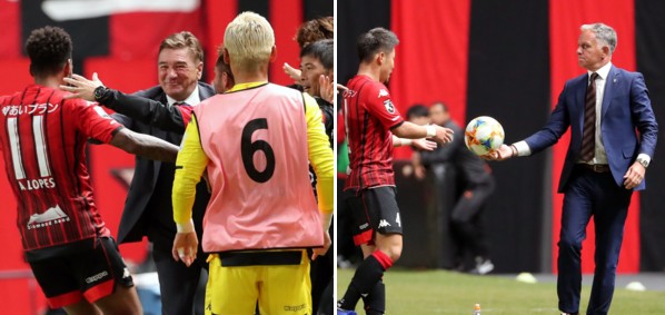上:左側写真/後半24分、4点目を決めたアンデルソン・ロペス(11番)を笑顔で称える札幌のペトロビッチ監督