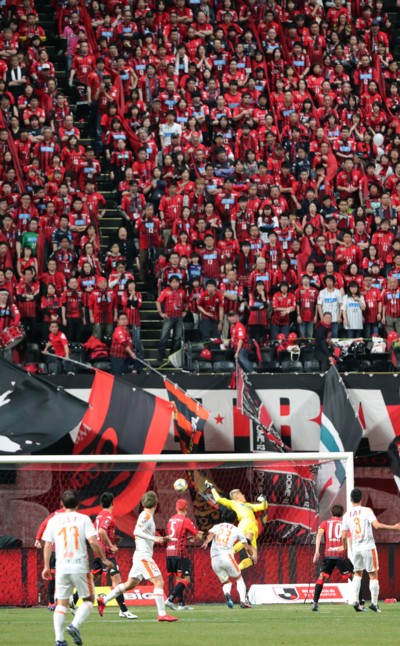 上写真/前半36分、清水右CKをMF金子がニアサイドに蹴り、DF松原にヘッドで決められる。札幌GKク・ソンユンがジャンプして止めようとしたがボールはゴールネットに突き刺さり同点とされた。ビッシリのゴール裏サポーターからタメ息が漏れる