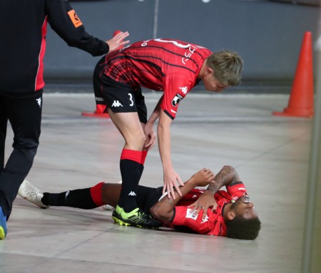 上写真/後半4分、2点目を決め喜んだアンデルソン・ロペスがサポーターに近づこうと思わずフェンスを飛び越え転落して転倒、左肩を痛そうに押える。DF進藤が心配そうに声をかける。この後、無事復活して2ゴールを追加したので安心したが、周知徹底はもちろん、防護柵(ネット)など対策が急務ではないか?