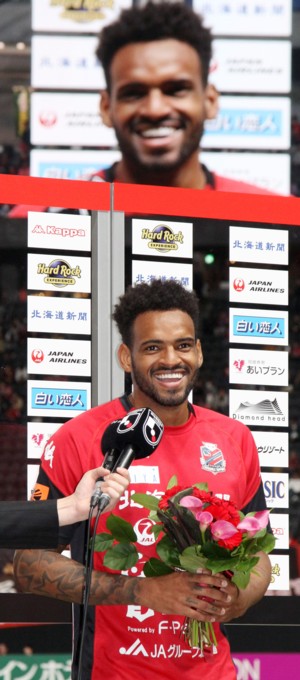 上写真/4得点を決めたアンデルソン・ロペス(11番)がヒーローインタビューでかわいい笑顔を見せた