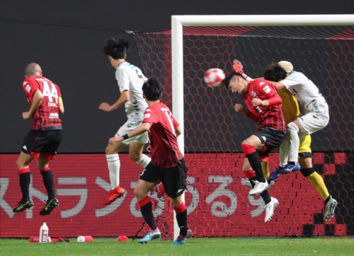 上写真/前半追加タイム2分、札幌左CKからの攻撃でDFキム・ミンテがヘディングシュートをするが決まらず、左端MF檀崎(17番)、右手前岩崎(13番)