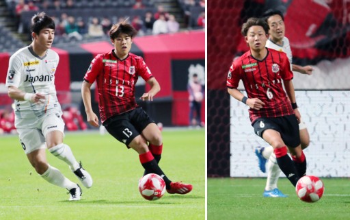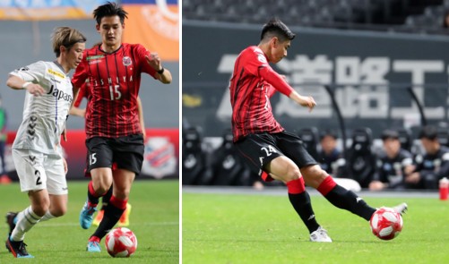 上:左側写真/今回の試合では、多くの新加入選手と若手選手が起用された。前半6分、軽快なフットワークを見せる札幌の新加入選手MF岩崎(13番)、左は長崎のDFイ・サンミン(26番)。岩崎は14日に発表されたU−23日本代表選手に選ばれた