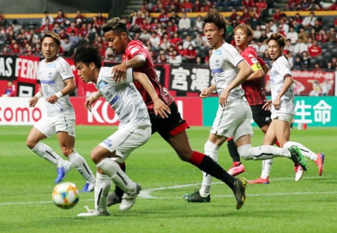 G大阪の攻撃は前半14分。センターサークルあたりで札幌の縦パスをカットし、FWアデミウソンがボールを拾う。激しいコンタクトからボールをキープしたアデミウソンは前線に走り込んでいるFWファン・ウィジョへスルーパス。受けたファンはドリブルで進みペナルティーエリア内左からシュートを放つもバーの上。