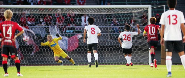 試合は前半13分、バックスタンド側の副審が旗を挙げた。ペナルティーエリア内で双方の選手が小競り合い。主審が副審と話し合いPKマークを指さす。宮澤キャプテンらが不服の態度を示すが、笠原寛貴主審(1級審判・PK判定数3点=レフェリー名鑑より)はHonda側に促す。FW遠野大弥(20)が決める。その数分後、再びHondaにPKを与える判定、やはり遠野が挑んだがGK菅野孝憲が同じコースを読んで抑えた。