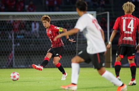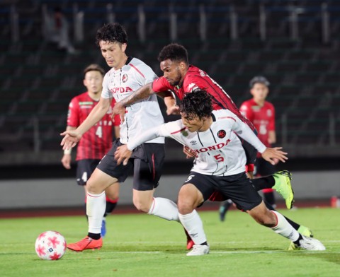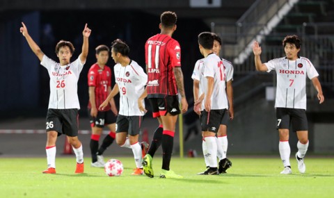 Hondaが押し気味にポゼッションを展開。31分にFW同士のパス交換から背番号10古橋達弥(38=湘南ベルマーレ出身)の浮き球を遠野が決めて2点目。この後33分にコンサドDF中村桐耶が、相手GK白坂楓馬の中央へのミスキックを直接蹴り込み、1点差で前半は終了。
