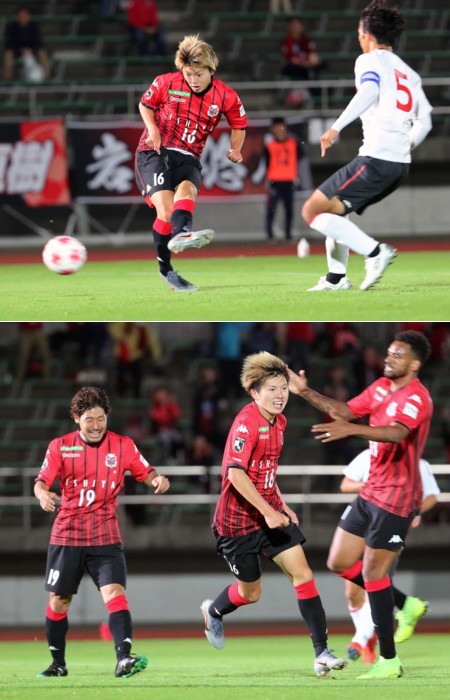 上:上段写真/後半10分、札幌MF藤村(16番)がルーカス・フェルナンデスのパスを受け、HondaのDF鈴木(5番)をかわしてプロ初ゴールを決め同点とする