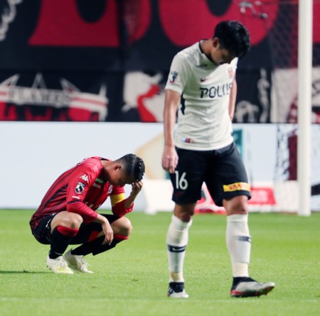 上写真/緊迫した好試合は1−1のドローに終わり、札幌MF荒野(左)と浦和MF青木(16番)の両者とも疲れ切った様子でガックリ
