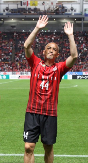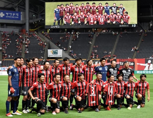 上写真/8月10日、J1第22節浦和戦の前に札幌ドームで行われた河合竜二さんの引退試合。横浜F・マリノス、北海道コンサドーレ札幌を中心に豪華なメンバーがそろった。後列右から2人目は岡田武史元監督