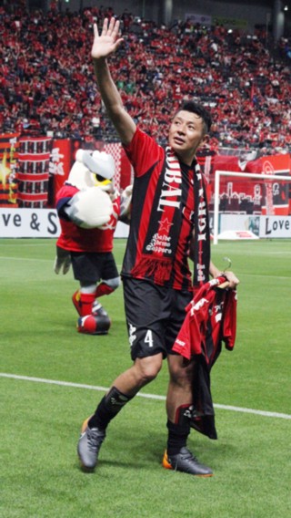 上写真/引退試合終了後、サポーターに手を振る河合竜二さん